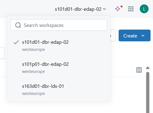 In addition to your personal workspace, Databricks provides access to several shared environments, each designed for a specific purpose. You can see environments you have access to in the dropdown menu, normally at the top right of the Databricks interface.