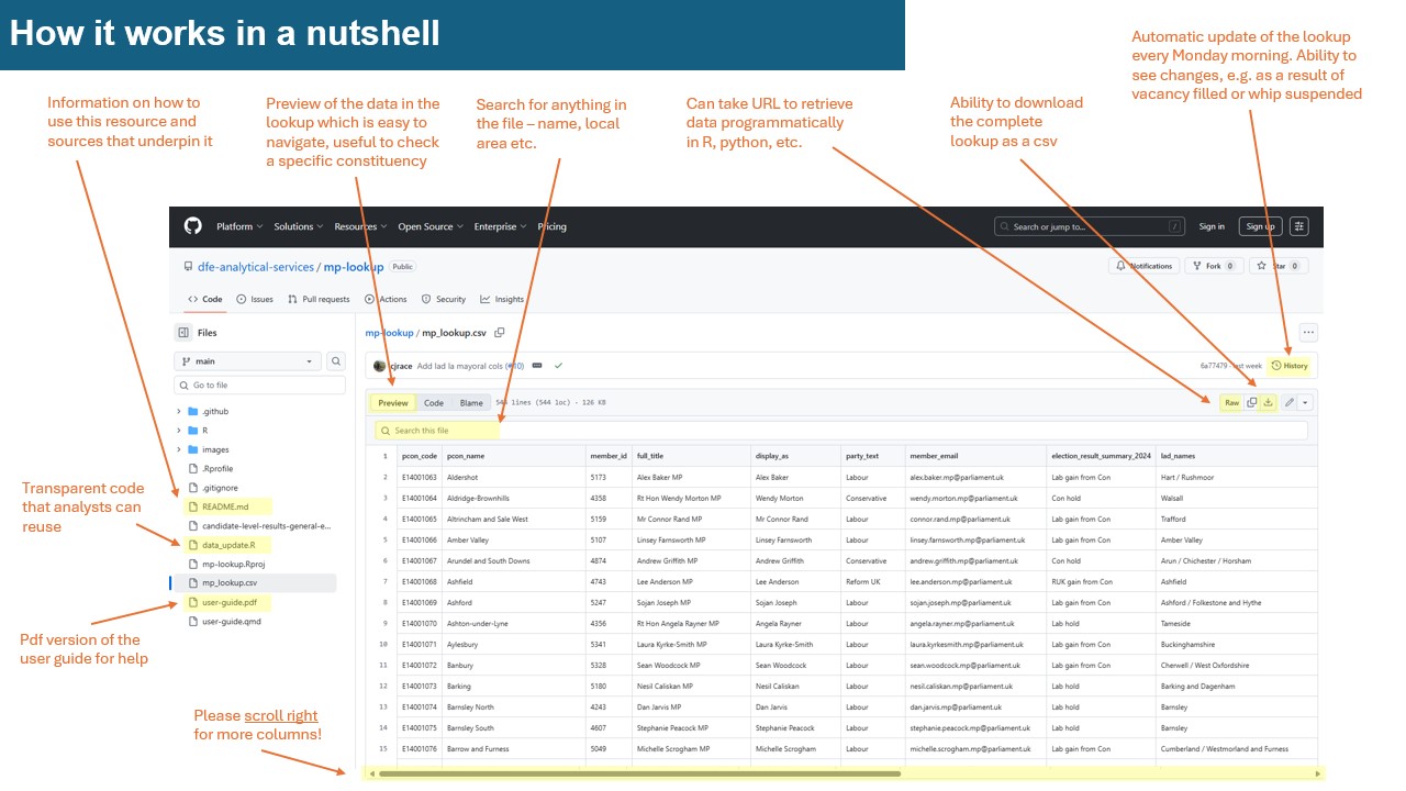 This download will retrieve a CSV copy of the look-up table that can be opened in Excel and PowerBI or with developer tools such as R or Python. Alternatively if you want to connect to the data using code, use the direct link to the raw mp_lookup.csv.