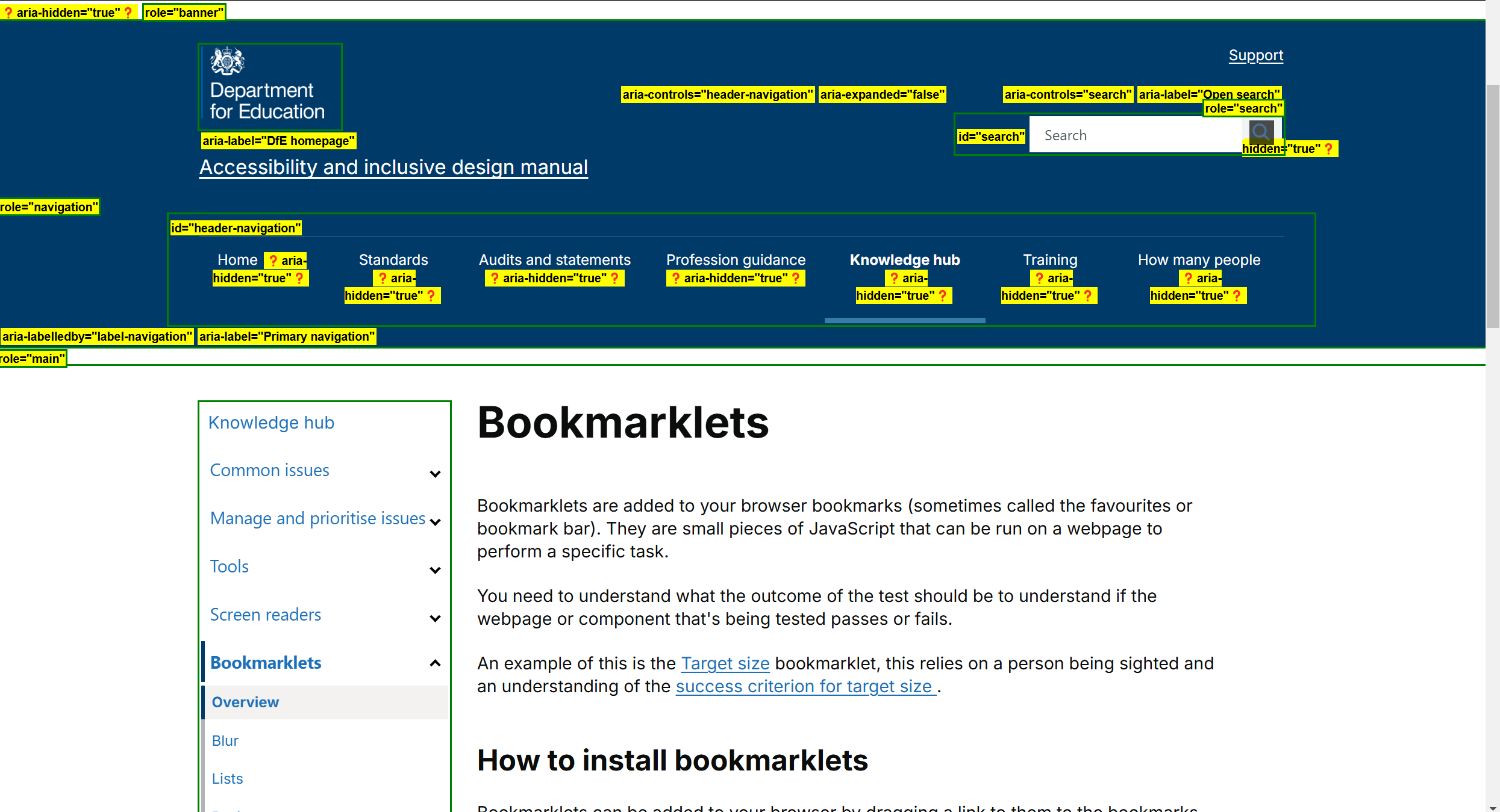 There’s some nice accessibility focused bookmarklets on the DfE design manual that highlight specific types of mark up such as headers and lists so you can easily check if it matches what you’d expect while on any webpage. Very nifty and low effort too!