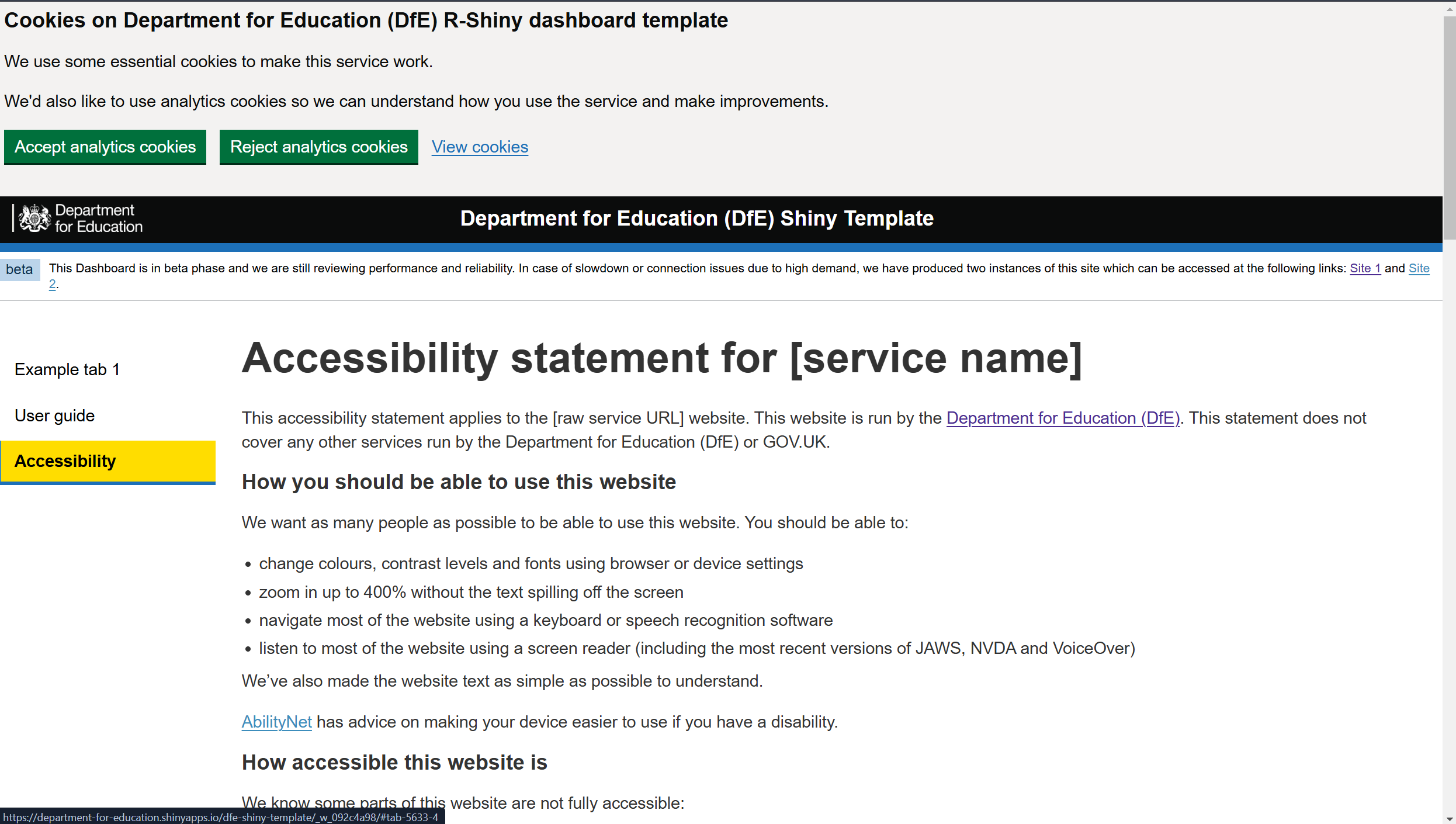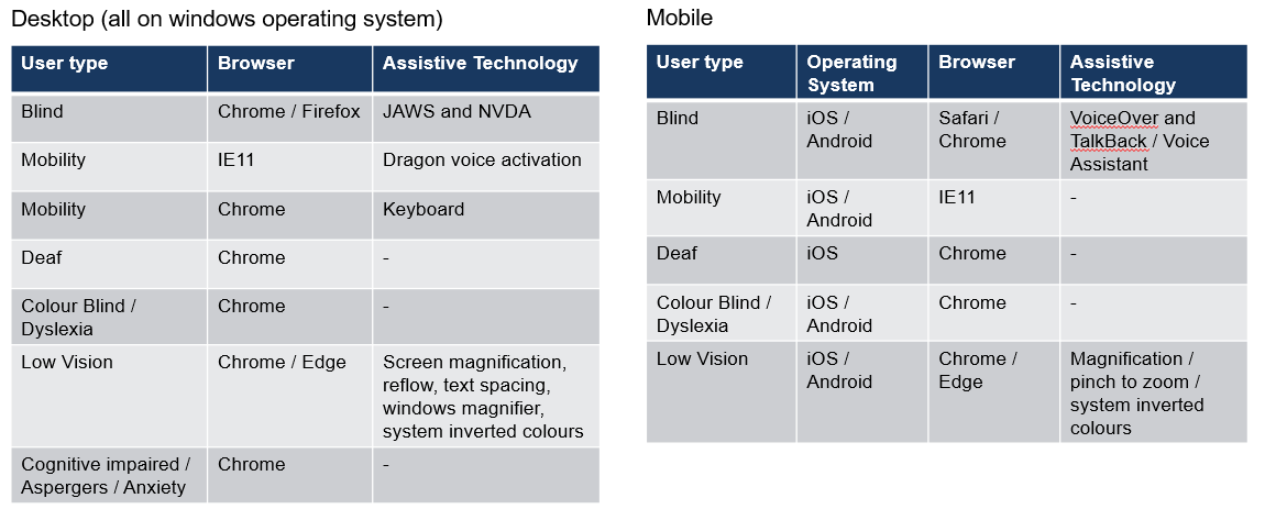 In our latest one we extended it to include our R Shiny template, and 2 public shiny dashboards too. This tests with multiple users of different accessibility needs using both desktop and mobile devices and provides a comprehensive report for any areas that fail.