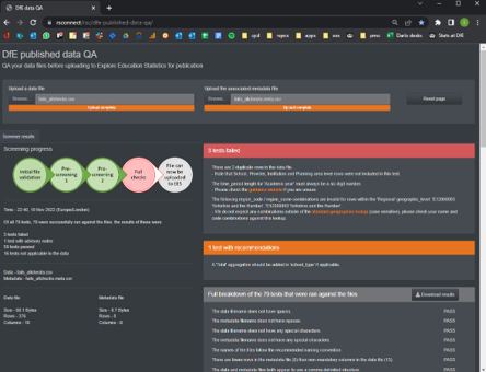 It runs automated tests against formatting best practice and data harmonisation rules (e.g. consistent labels for key variables) and provides quick feedback and guidance where files fail.