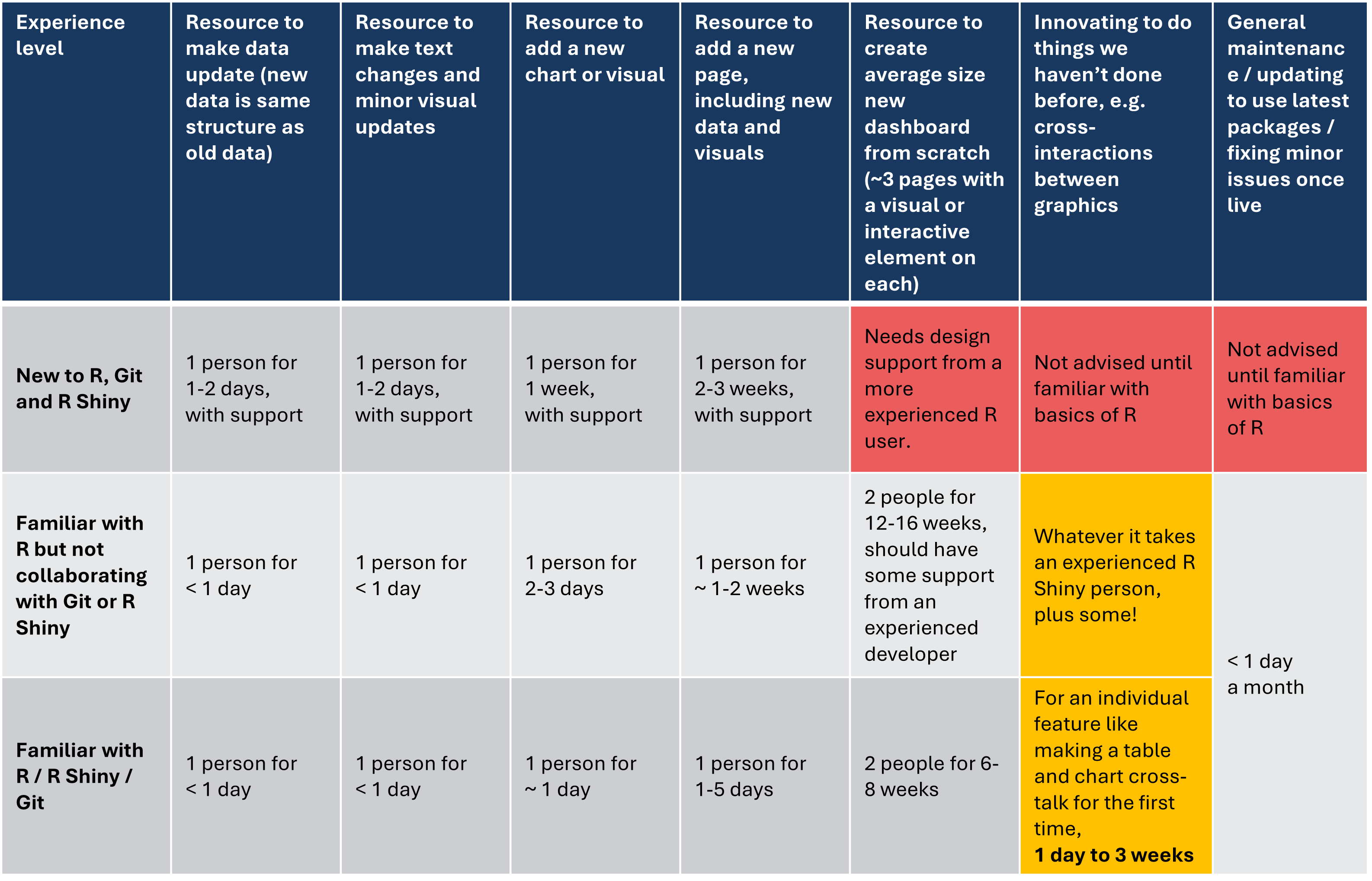 Recently, we’ve been gathering inputs from a range of analysts working with R Shiny across DfE and other departments and come up with this table of rough estimates for development timelines.