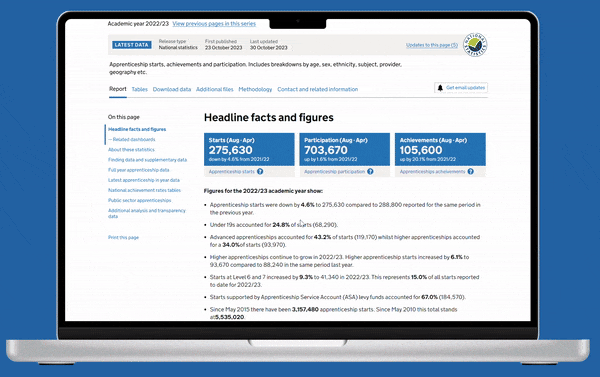 Dedicated digital support to all statisticians and analysts publishing data publicly, leading the development of the explore education statistics (EES) service and public facing dashboards.