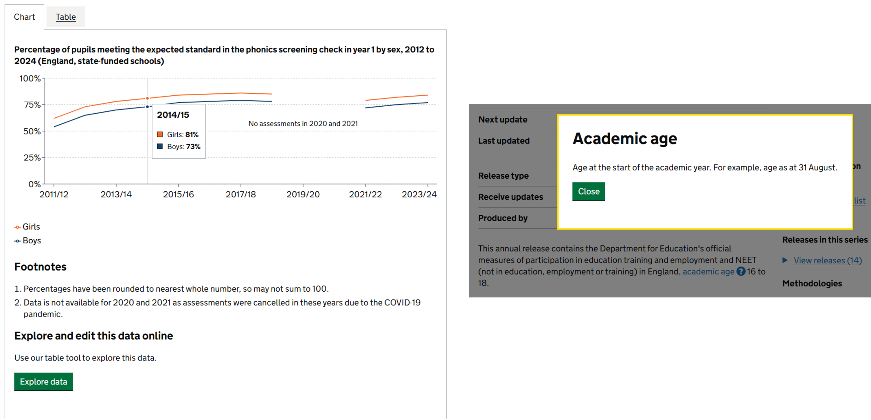 Footnotes are automatically generated alongside data items in line with the rules statisticians set up within EES admin.