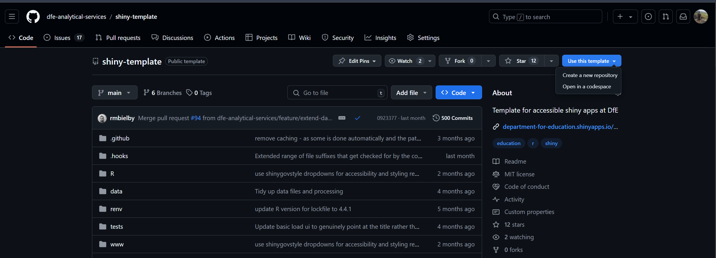 Example workflow file in our R Shiny template - .github/workflows/deploy-shiny.yaml